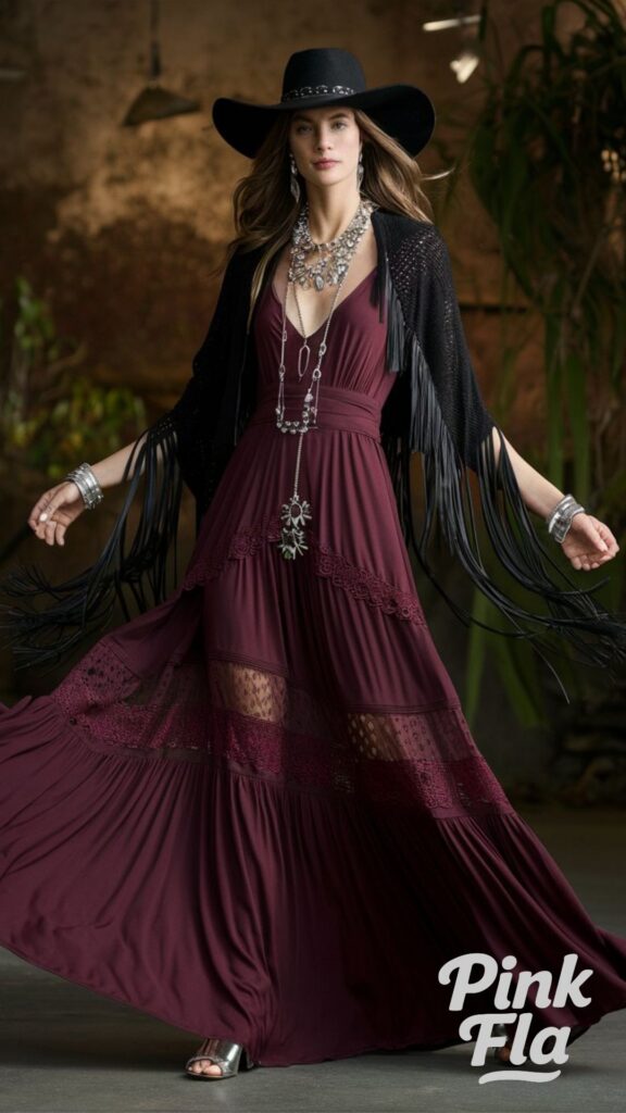 A flowy burgundy dress adorned with detailed lace accents pairs beautifully with a soft black fringed shawl and a classic wide-brimmed hat, creating an effortlessly elegant dark boho look. The rich burgundy hue and delicate lace bring a touch of romantic mystique, while the fringed shawl adds a bohemian texture and warmth.