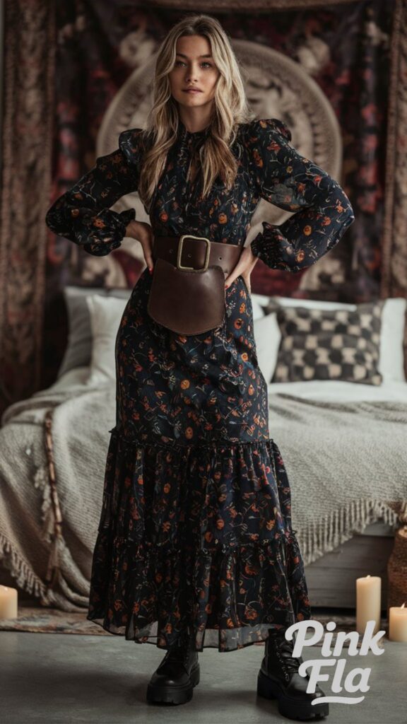 This outfit is designed for staying comfy and stylish indoors, embodying a warm and inviting boho aesthetic. A long floral dress, featuring a rich, dark floral pattern, provides a flowing and relaxed fit. It’s cinched with a wide belt and paired with sturdy boots, grounding the whimsical print with practical elements.