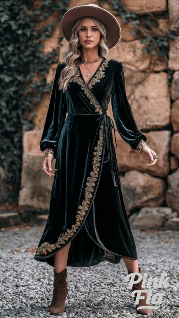 This outfit is perfect for a special evening, adding a touch of elegance to the boho look with its luxurious textures and detailed design. A velvet wrap dress with stunning gold embroidery creates a rich, opulent feel, catching the light beautifully.