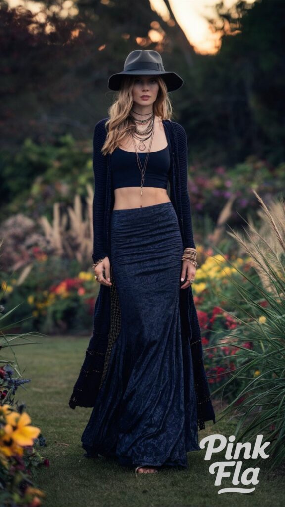 A chic navy crop top perfectly matched with a flowing skirt is layered effortlessly with a long cardigan, creating an ideal look for a relaxed garden stroll. This combination provides comfort and a beautiful sense of movement, perfect for leisurely outdoor activities. A wide-brimmed hat adds a touch of classic bohemian charm and essential sun protection.