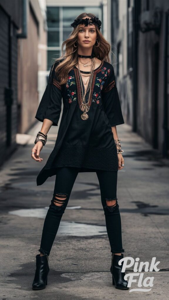 This look defines urban boho with a bold black tunic featuring vibrant, colorful embroidery, worn effortlessly with ripped black jeans and chic heeled boots. The embroidery adds an artistic, free-spirited touch to the edgy urban base of the distressed denim and sleek footwear.