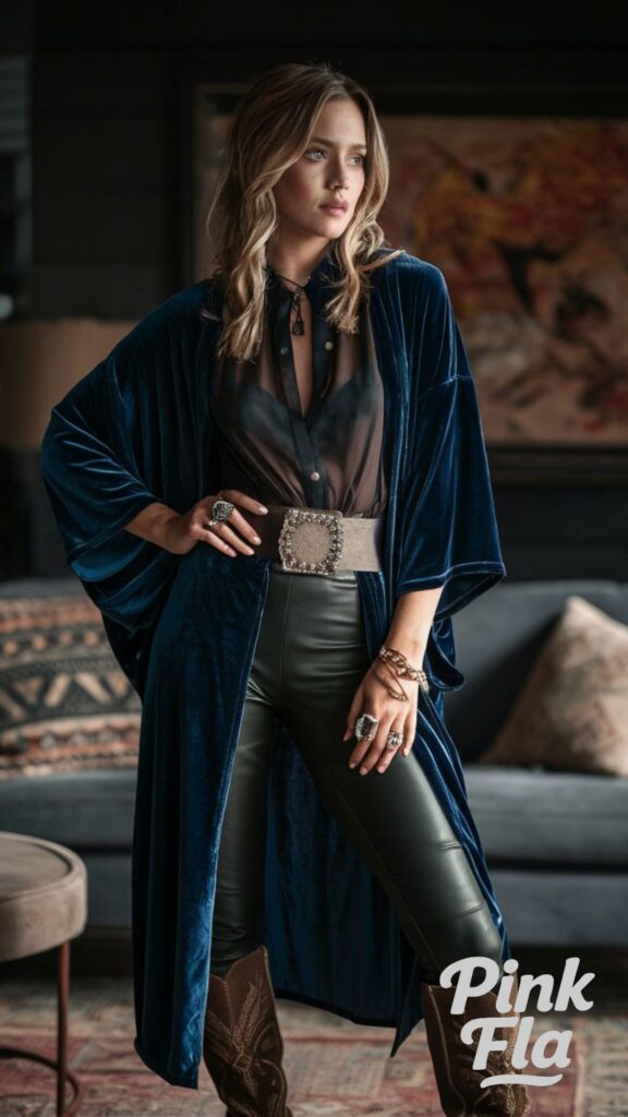 A rich blue velvet kimono layered over a sheer blouse and sleek leather pants forms a luxurious and bold outfit, finished with a statement belt and chunky rings. The sumptuous velvet of the kimono adds an opulent, dark romantic touch, while the sheer blouse provides an intriguing peek-a-boo element.