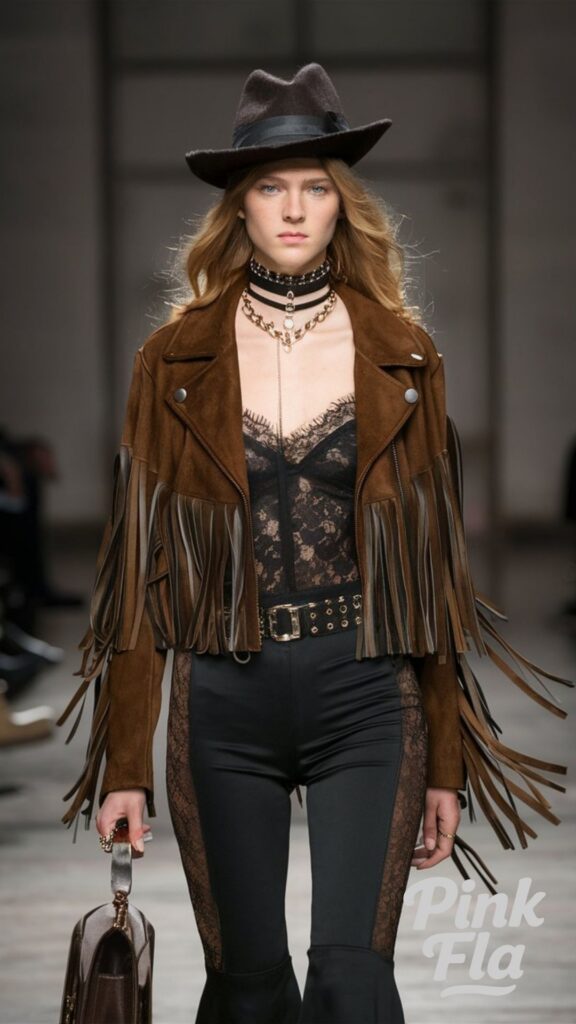 This outfit perfectly blends rustic charm with bohemian flair, creating a unique Western boho feel. A stylish brown suede jacket with fringe is worn effortlessly over a delicate lace bodysuit and sleek black pants, offering layers of texture and interest.