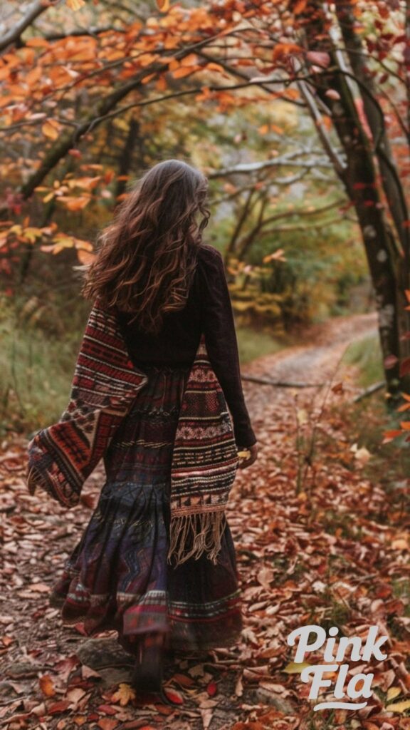 This ensemble includes a dark, printed skirt and a warm shawl, capturing the cozy feeling of fall.