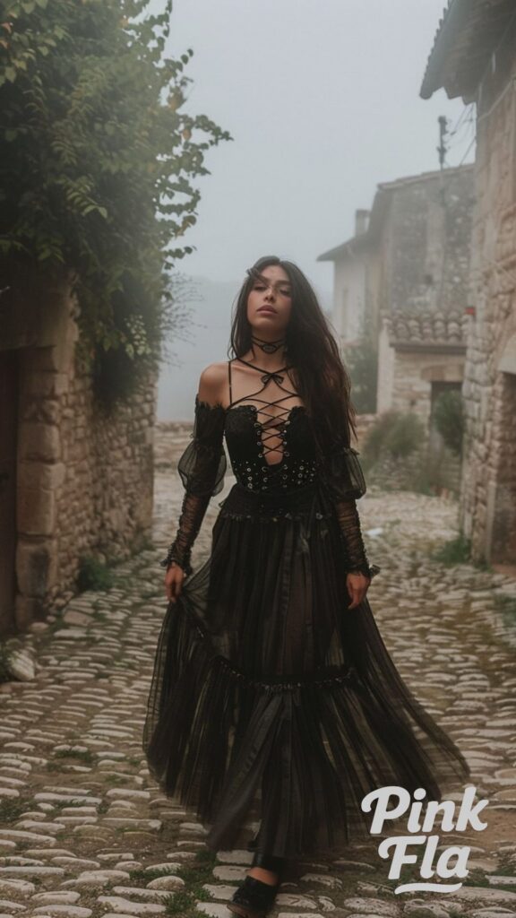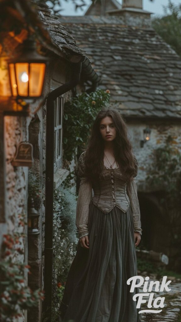 Layered fabrics and rich textures give the outfit a sense of depth and history, perfect for wandering through an old-world village.
