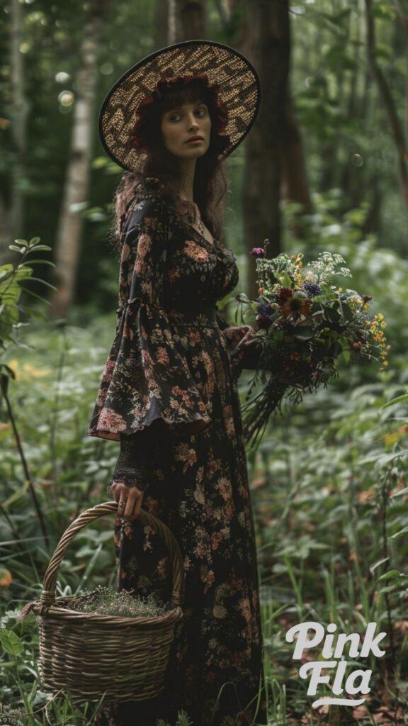 The look is tied together with a wicker basket filled with wildflowers, adding to the magical and countryside-inspired vibe.