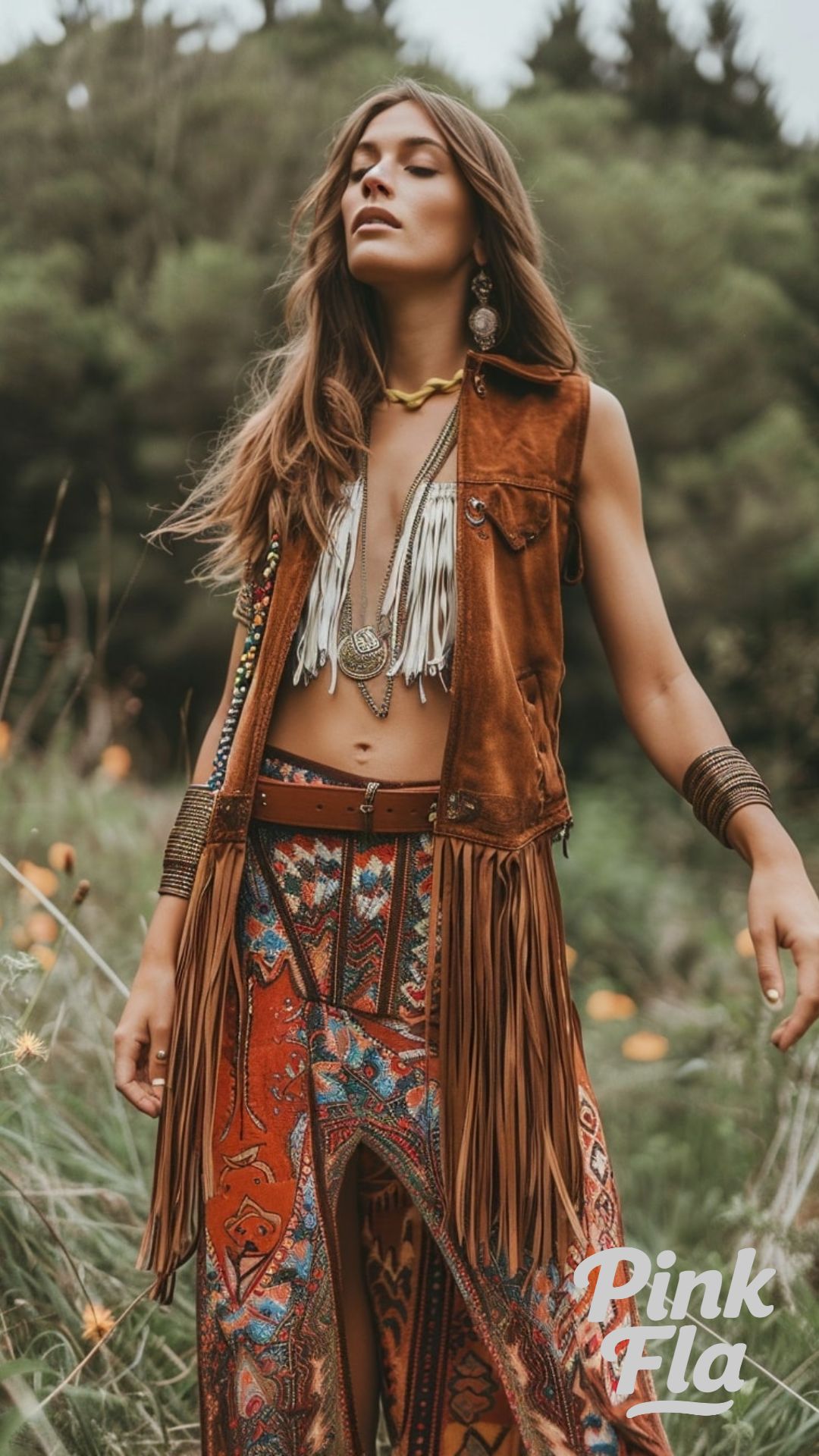 Layered fabrics and rich textures give the outfit a sense of depth and history, perfect for wandering through an old-world village.