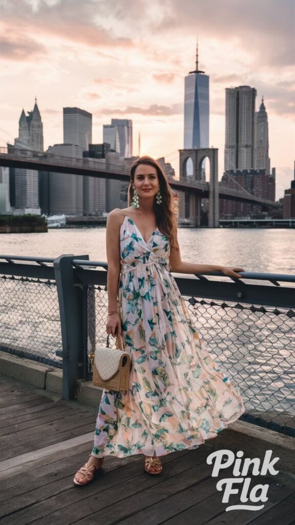 A flowy floral maxi dress is perfect for warm summer nights along the Hudson or a rooftop dinner.