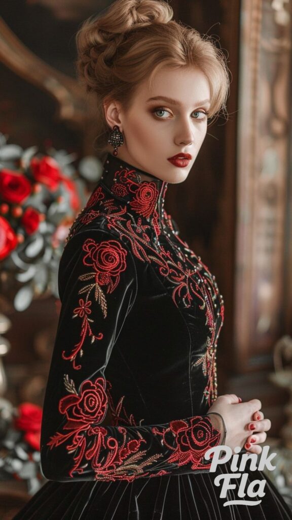 Crafted from luxurious black velvet, this high-neck gown features stunning red rose embroidery that exudes regal gothic beauty.