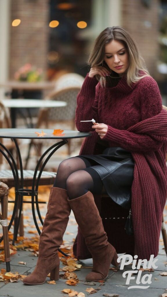Rich burgundy layers and textured pieces make this outfit a perfect and inviting choice for the fall season. A chunky knit turtleneck, in a deep burgundy hue, creates a cozy yet bold statement, offering warmth and a touch of luxurious color. Paired with a sleek black leather mini skirt, it strikes a balance between comfort and edgy style.