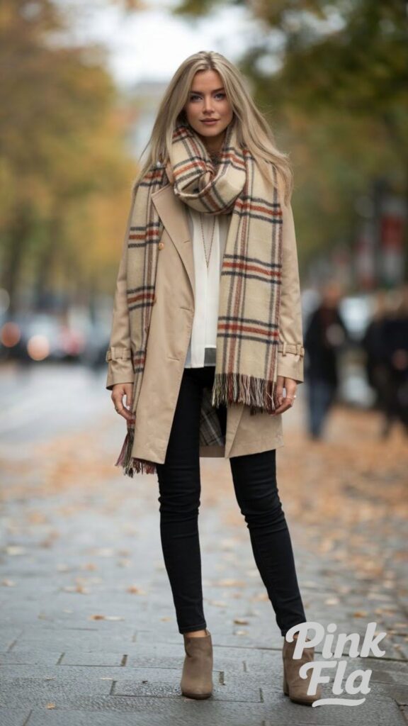 A classic trench coat teamed with sleek black skinny jeans and versatile ankle boots captures the very essence of effortless fall style. The trench coat offers timeless sophistication and a flattering silhouette, perfect for transitional weather. The oversized plaid scarf adds both cozy warmth and a stylish pop of pattern, making this outfit both practical and visually engaging.