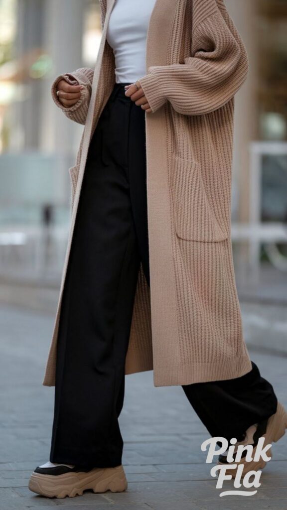 Stay comfy and effortlessly stylish in this relaxed fall outfit, designed for ultimate ease. It features an oversized beige cardigan layered over a simple white tee, creating a soft and inviting combination of textures and neutral tones. Wide-leg black pants and chunky sneakers give it a modern, effortless look that’s both on-trend and incredibly comfortable.