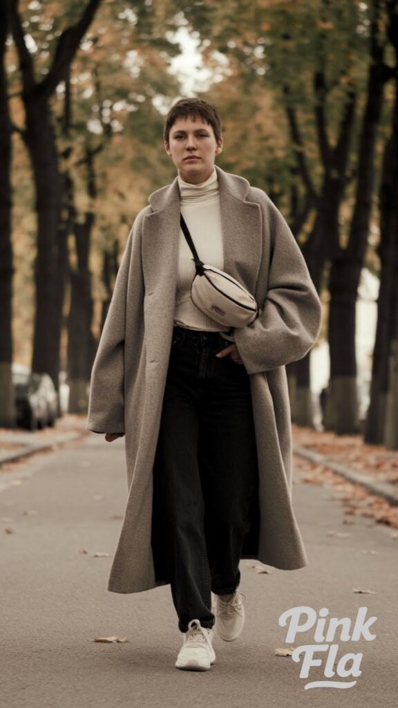 Ideal for bustling city errands or even a semi-casual business meeting, this is a modern take on timeless style that exudes quiet confidence. It’s perfect for those who appreciate understated elegance and clean lines in their autumn wardrobe.