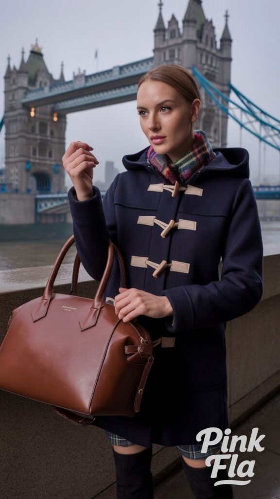 A classic toggle coat and a plaid scarf create an elegant look that’s great for seeing London’s famous sights.