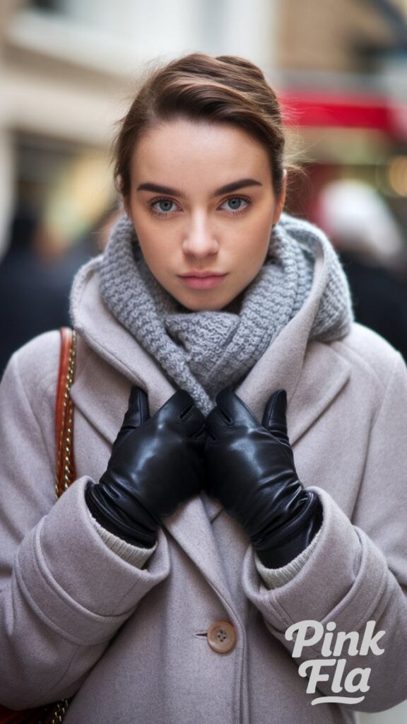 A well-fitted winter coat, a chunky knit scarf, and sleek leather gloves come together for a smart, warm look.