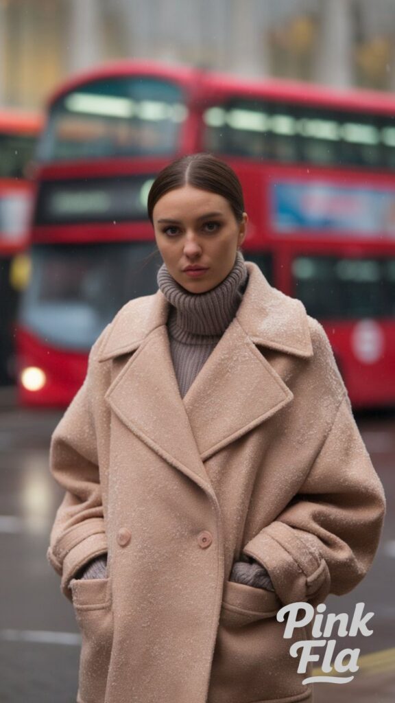 A turtleneck layered underneath offers extra warmth, making this look ideal for chilly walks through London’s cityscape.