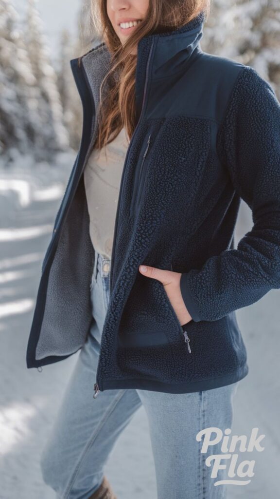 This outfit combines practicality and comfort, featuring a cozy fleece jacket ideal for cold-weather activities. The jacket’s soft material provides warmth without adding bulk, making it perfect for layering over casual tops for everyday ease. Its functional design ensures comfort during active days.