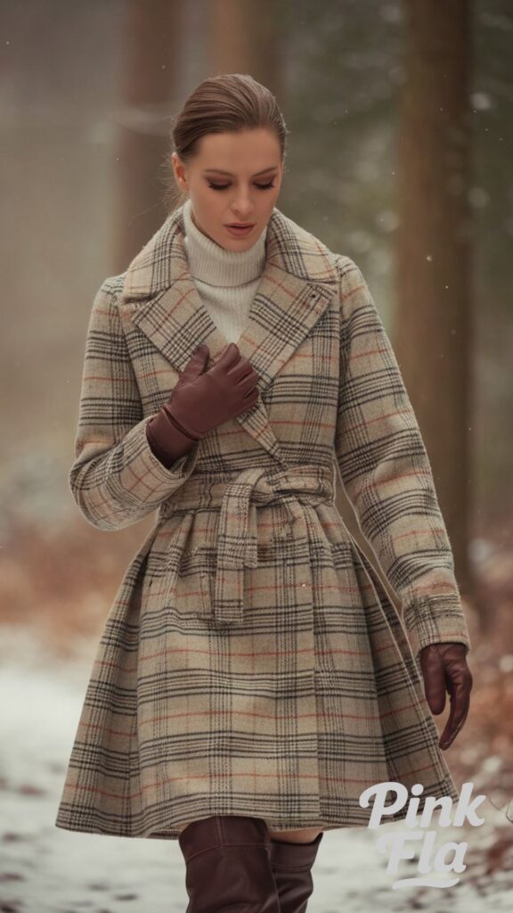 This fashionable winter outfit is centered around a timeless plaid belted coat that adds both shape and essential warmth. The coat’s muted shades blend nicely with the serene winter scenery, creating a harmonious and sophisticated aesthetic. Worn over a warm turtleneck sweater, it keeps you snug and comfortable against the chill.