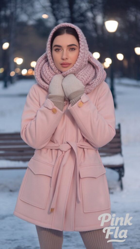 This lovely winter outfit highlights a light pink belted coat that keeps you warm and stylish, radiating gentle charm. Its shape is both structured and comfortable, while the belt cinches the waist beautifully for a flattering silhouette. A thick knit scarf in a matching pastel tone adds extra warmth and a cohesive feel.