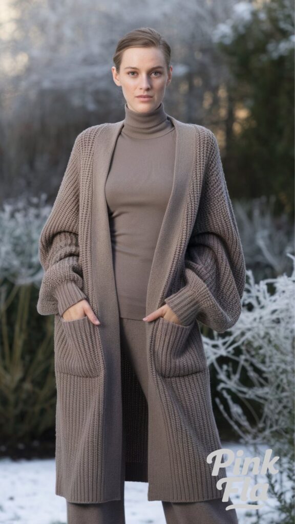 This winter outfit gracefully brings together soft taupe tones for a polished and cozy look on cold days. It features a long chunky knit cardigan that adds warmth and rich texture to the style, creating an inviting silhouette. A fitted taupe turtleneck top and comfortable wide-leg trousers in matching shades keep things refined and chic.