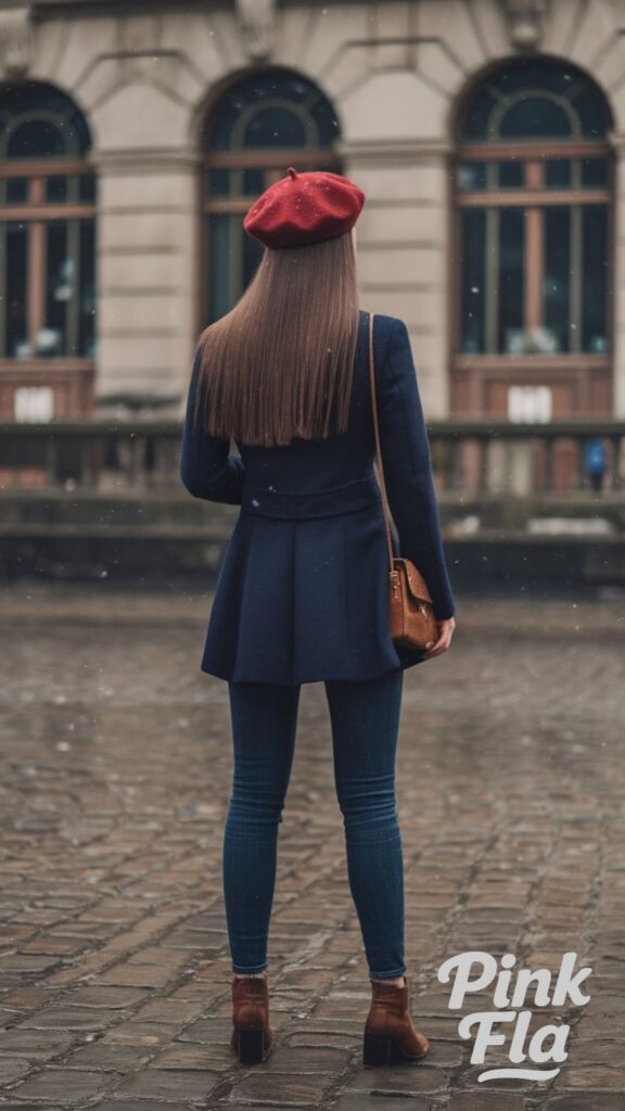 This winter look is inspired by classic Parisian fashion, blending elegance with warmth. The navy tailored coat adds sophisticated shape and essential insulation, providing a chic outer layer. The vibrant red beret gives a bright, stylish pop of color, adding a playful and iconic touch to the ensemble.