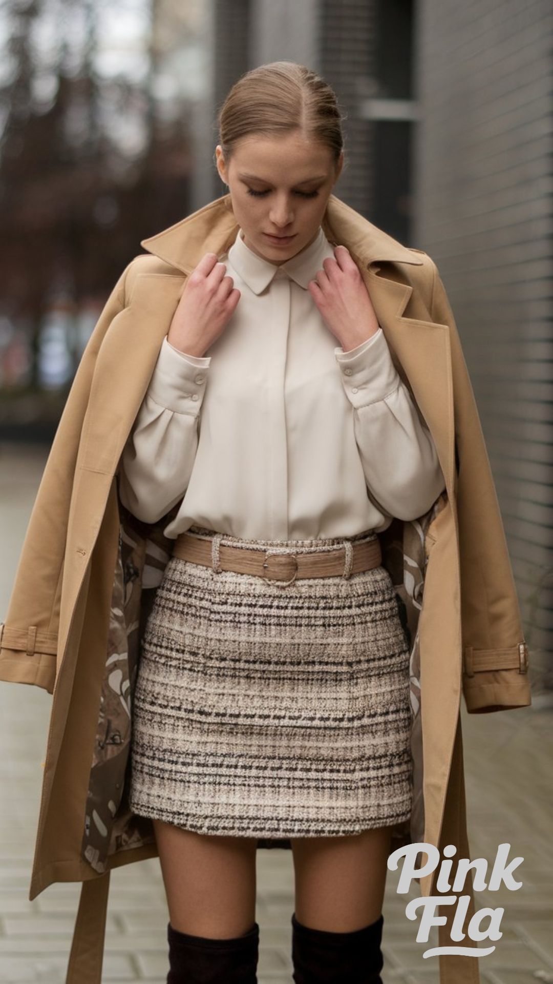 This look features a classic beige trench coat—an excellent choice for walking snowy European streets in timeless style. A chunky knit scarf and gloves keep you warm, providing essential protection against the cold. Sleek knee-high black boots add a polished touch, completing the sophisticated silhouette.