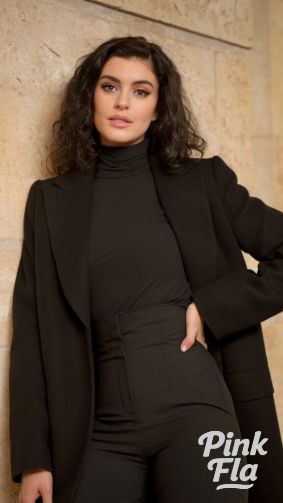 This all-black winter outfit is the epitome of clean and elegant European style, offering a universally flattering silhouette. Fitted high-waist trousers and a matching black turtleneck top create a streamlined shape, emphasizing poise. A long black coat adds essential warmth with a polished and sophisticated finish.