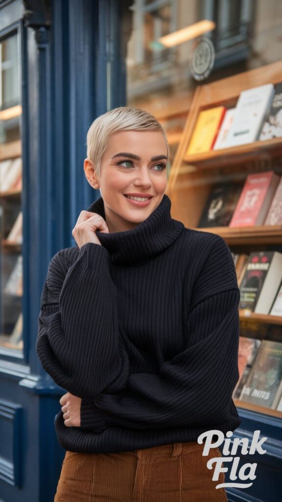 Perfect for Browse bookshops or relaxing in charming cafés, this look is both stylish and wonderfully comfortable. The oversized black turtleneck sweater provides warmth with a loose, easy fit, creating a relaxed yet polished silhouette. Corduroy pants add a delightful bit of texture and retro flair, making the outfit uniquely appealing.