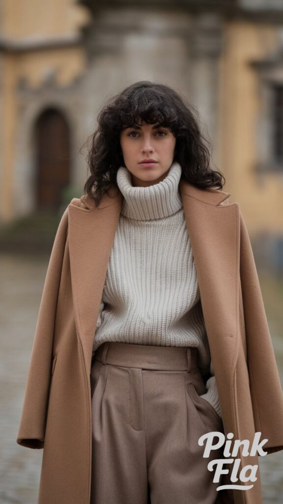 Neutral tones truly shine in this effortlessly elegant winter ensemble, embodying classic European style. An oversized knit turtleneck sweater brings comforting warmth and a relaxed feel, creating an inviting silhouette. Elegant wide-leg trousers and a tailored camel coat add sophistication and structure, completing a refined aesthetic.