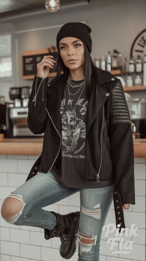 A black knit beanie tops off the outfit, keeping it cool and casual with just the right amount of attitude. This is a perfect pick for coffee dates where comfort and personality take the lead, allowing your unique style to shine.