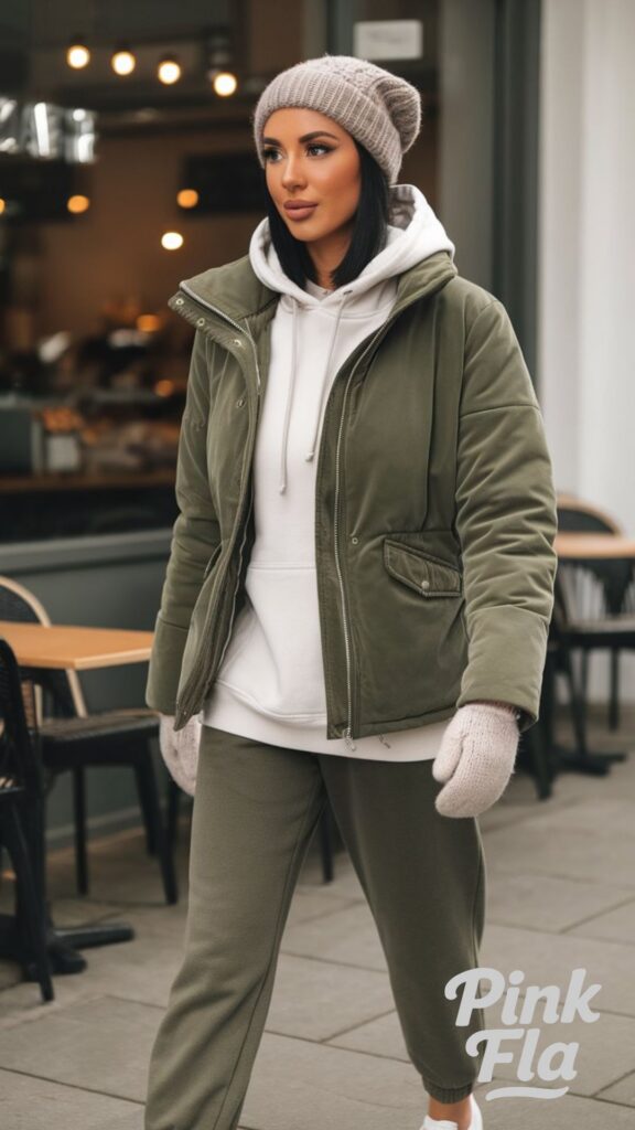 Stay warm and stylish in this effortlessly casual winter outfit, perfect for a relaxed day outdoors. A soft cozy hoodie layers perfectly under an olive green padded jacket, offering insulation without bulk. Matching joggers keep things relaxed and comfortable, making movement easy.