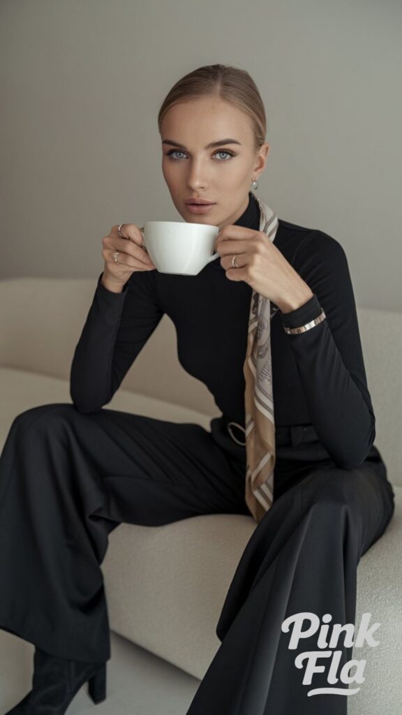A light neutral silk scarf brings a gentle contrast and a touch of subtle luxury, enhancing the simplicity without overpowering it. This ensemble is perfect for a coffee date in a quiet café or a polished, professional meet-up, exuding understated grace.