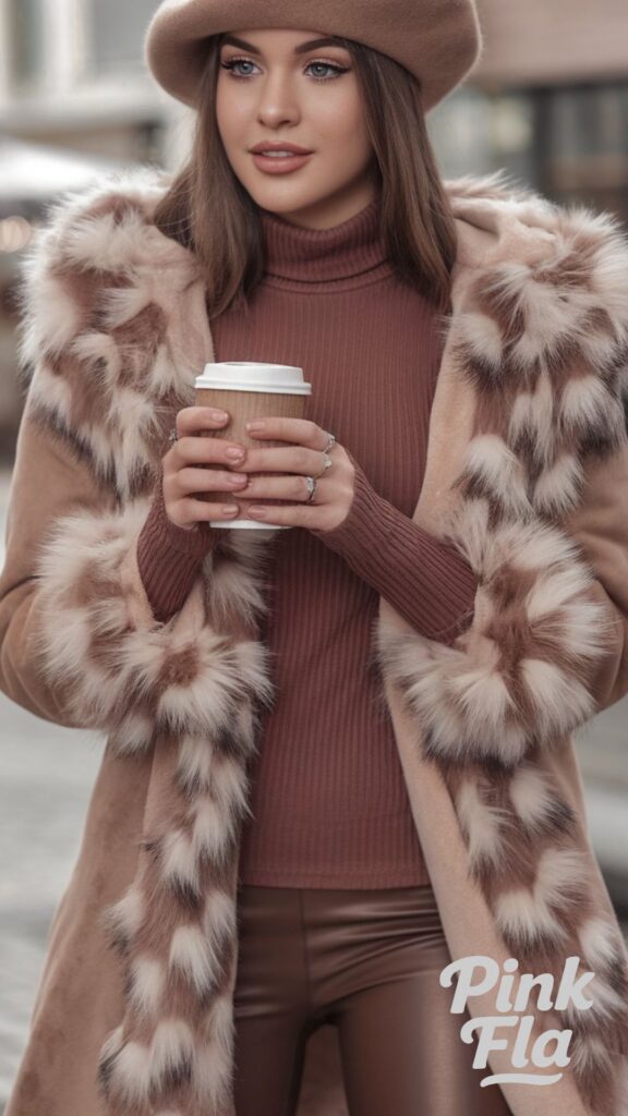 Faux fur accents bring subtle luxury, making this look as stylish as it is snug for cooler temperatures. It’s great for café meetups or Browse a winter market, offering both comfort and charming appeal.