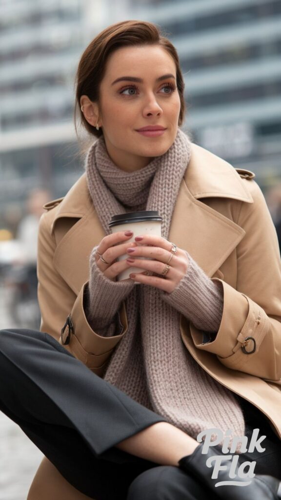 This sophisticated winter outfit features a classic beige trench coat layered elegantly over a cozy knit scarf, perfect for crisp, early coffee outings. The trench coat’s timeless appeal provides both warmth and a refined silhouette. Soft taupe accessories add warmth and texture, enhancing the harmonious color palette.
