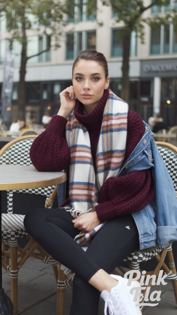 Blending comfort with a hint of city chic, this layered look is perfect for casual winter outings. The deep maroon turtleneck adds warmth and a rich pop of color, while a plaid scarf brings visual interest and an extra layer of coziness. A light denim jacket draped casually over the shoulders ties it all together, making for an easy transition from outdoors to indoors.