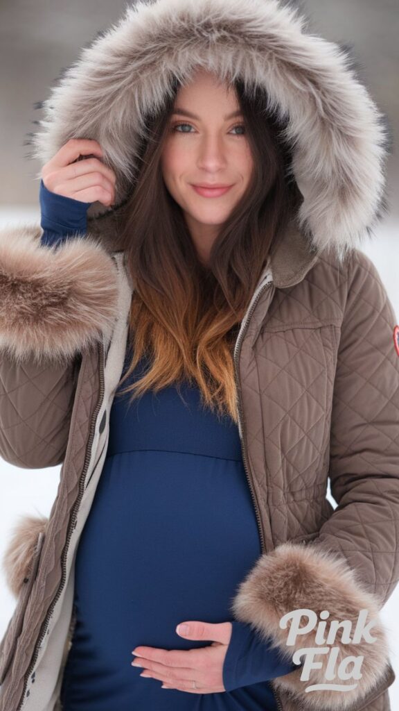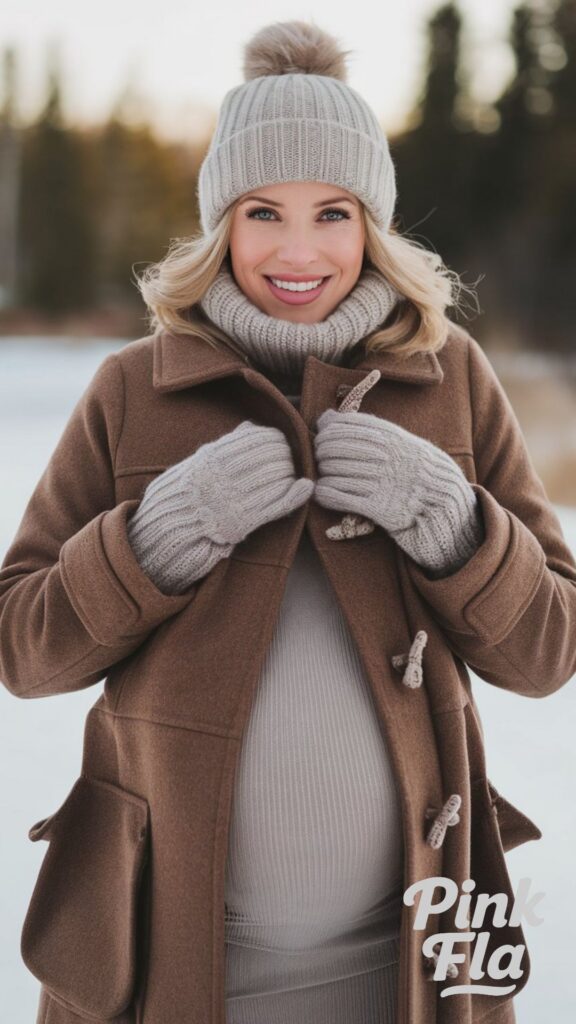 Topped off with insulated winter gloves, this look ensures comfort and warmth for invigorating walks or extended time spent outside in the winter chill. It’s a practical yet stylish choice for embracing outdoor activities during pregnancy.