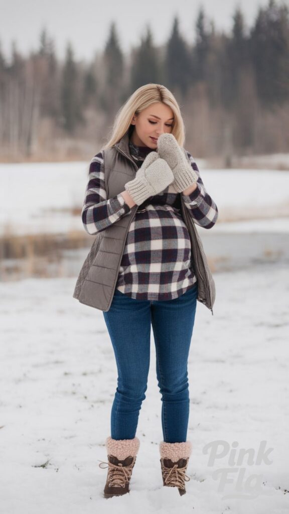 This relaxed winter look is ideal for staying cozy during outdoor activities while offering ease of movement for moms-to-be. The sleeveless puffer vest adds a layer of insulation without feeling bulky, providing warmth without restricting arm movement. A comfortable maternity sweater underneath brings soft, essential warmth.