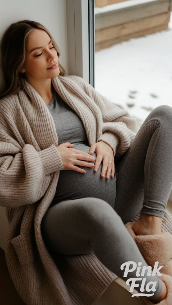 Whether you’re curled up by the fire, enjoying a peaceful afternoon, or simply unwinding at home, this cozy look keeps things simple and stylish. It’s an ideal choice for embracing quiet moments in ultimate comfort during your pregnancy.