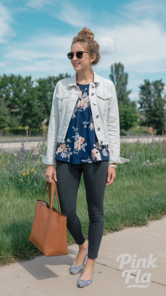 This outfit has that sweet spot between dressed-up and casual nailed down. A delicate floral top brings a fresh, springy feel, while a crisp white denim jacket layers on just enough structure without being too heavy. It’s light, pretty, and super easy to style.