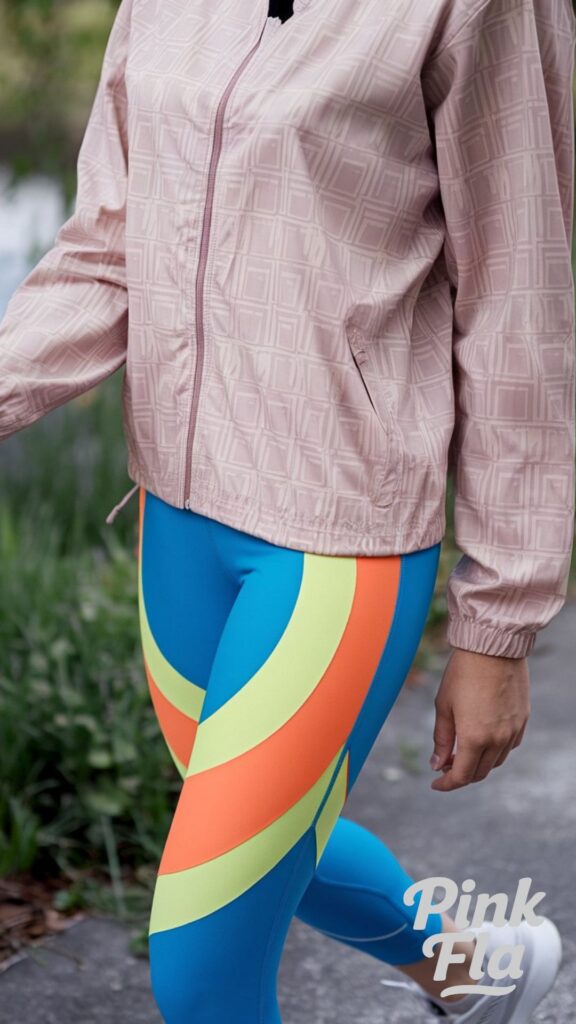 If you love to add a little color to your day, this outfit is the perfect pick. Bright, bold leggings take center stage here with their playful mix of colors and patterns. To balance out the vibrancy, a cozy neutral zip-up jacket adds a soft, calming layer that tones things down while still keeping the fun alive.