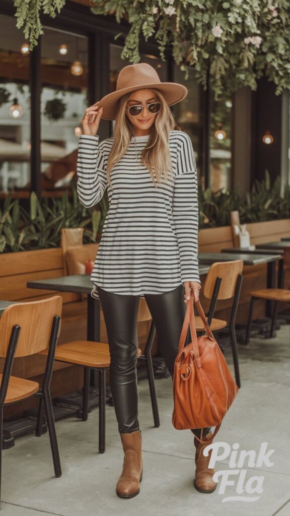 This look blends relaxed style with timeless touches for a versatile spring outfit. A classic striped long-sleeve top brings that casual, weekend-ready feel, while sleek black leggings keep the silhouette streamlined and comfy. It’s the kind of look that’s easy to throw on but still looks intentional.
