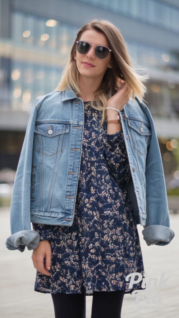 This look has that perfect “weekend ready” energy—cute, easy, and just the right mix of casual and feminine. A floral dress adds a sweet, playful element, and when paired with dark leggings, it gets a bit of extra warmth and structure. Throw a denim jacket on top, and you’ve got a timeless layering piece that pulls the whole outfit together with ease.