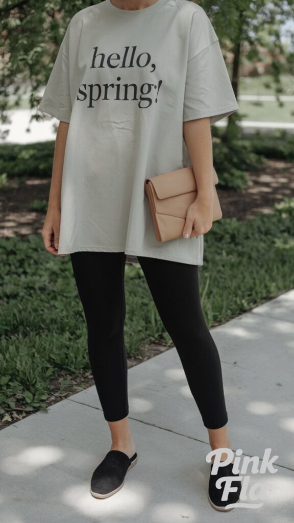 This outfit is the definition of relaxed spring style with a fun twist. The “Hello, Spring!” graphic tee sets a cheerful tone and pairs effortlessly with classic black leggings for a clean, casual base. It’s the kind of look you can throw on in a minute but still feel cute and ready for the day.