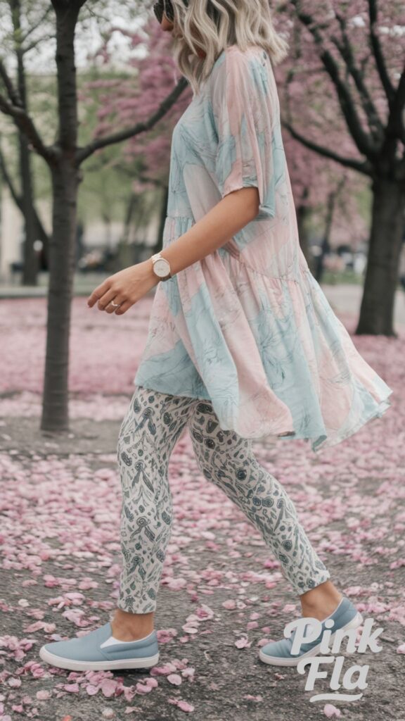If you’re in the mood for something comfy but still playful, this outfit is a springtime winner. The pastel, flowy tunic top gives off an airy, relaxed vibe, while the floral leggings add a splash of color and personality. It’s the kind of combo that feels great to wear but still looks thoughtfully put together.