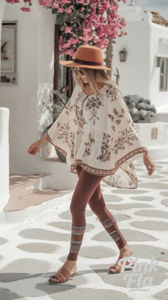 Channeling laid-back boho vibes, this outfit is both breezy and beautiful. A light, flowy floral tunic sets the tone with its relaxed shape and soft movement, while the earthy brown leggings keep the look grounded and comfortable. The subtle patterned trim on the leggings adds a fun little surprise detail that makes the outfit feel special.