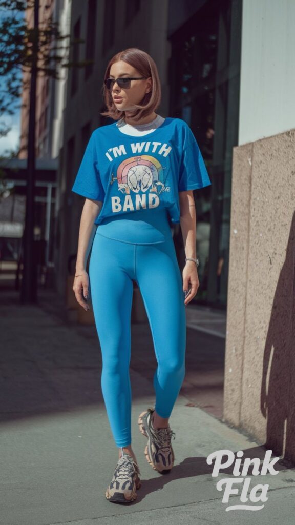 Full of color and personality, this outfit is fun, casual, and perfect for days when you want your look to say a little something. The bold “I’m With the Band” graphic tee brings in a playful edge, while the bright blue leggings add energy and movement to the look. It’s a simple combo that still stands out thanks to its bold color choices.