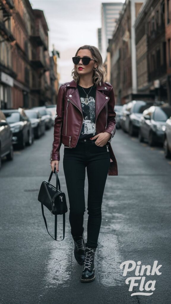 Stand out this fall with a bold burgundy leather jacket as your undeniable statement piece, injecting vibrant color into your edgy wardrobe. Worn over a cool graphic tee and perfectly paired with classic black skinny jeans, this look is equal parts rebellious and casually chic. Lace-up combat boots bring in a rugged, grounded touch, while oversized sunglasses and a structured handbag keep things undeniably fashion-forward and polished.