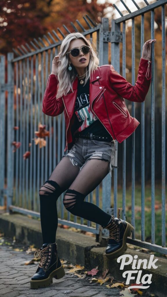 Turn heads with this daring fall outfit that exudes confidence and a rebellious spirit. A bold red leather jacket takes center stage, injecting vibrant color and an undeniable edgy attitude into the ensemble. It’s daringly paired with distressed denim shorts layered over black tights for added warmth and a strong, punk-inspired edge.