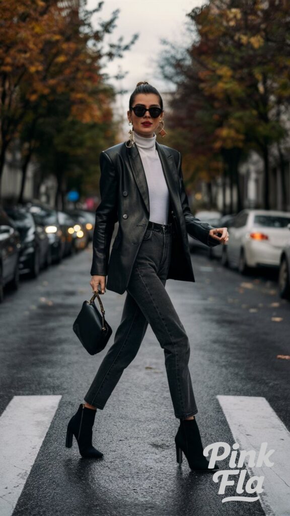 Chic and sharp, this monochrome outfit is perfect for fall days when you want to feel both polished and edgy. A tailored black blazer tops high-waisted jeans, creating a sleek and modern silhouette. A crisp white turtleneck brings a clean, striking contrast against the dark tones, adding to the outfit’s sophistication.