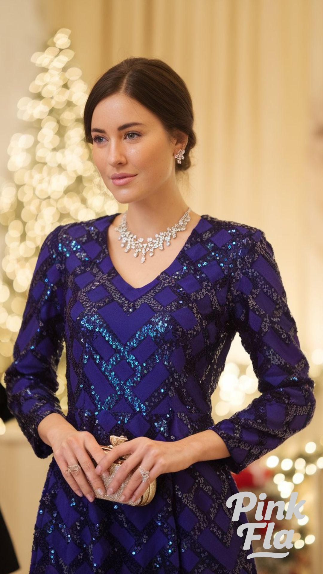 This ensemble is perfect for a boardroom presentation or a formal winter event where you want to look your best. It speaks of power and impeccable style without needing to be loud or use very bright colors. You will feel very regal and look very sophisticated in this navy and beige professional gown.